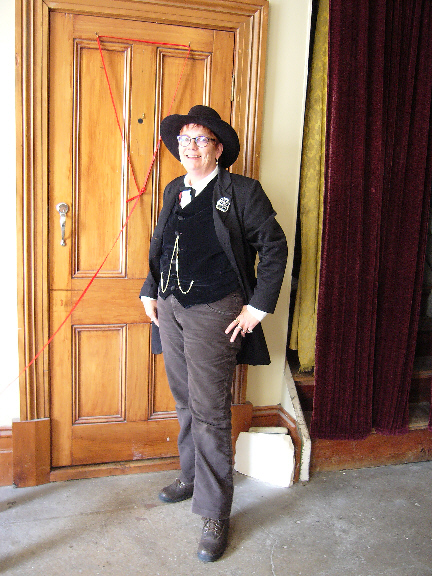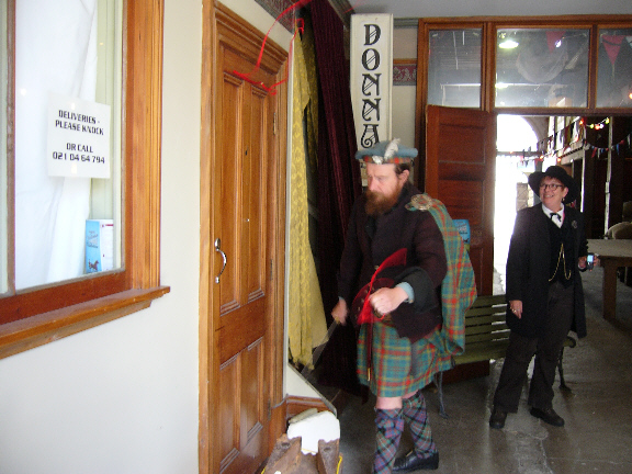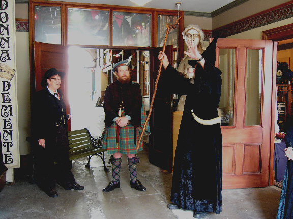 2. The Arch-Wizard of New Zealand QSM, Michael O'Brien (Bookbinder and 18th Century Scot), and Sue Leader, Goldsmith/Jeweller, await the final guests. (Photo by courtesy Yannick Servole, Photographer, Oamaru Mail) |