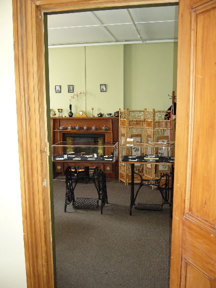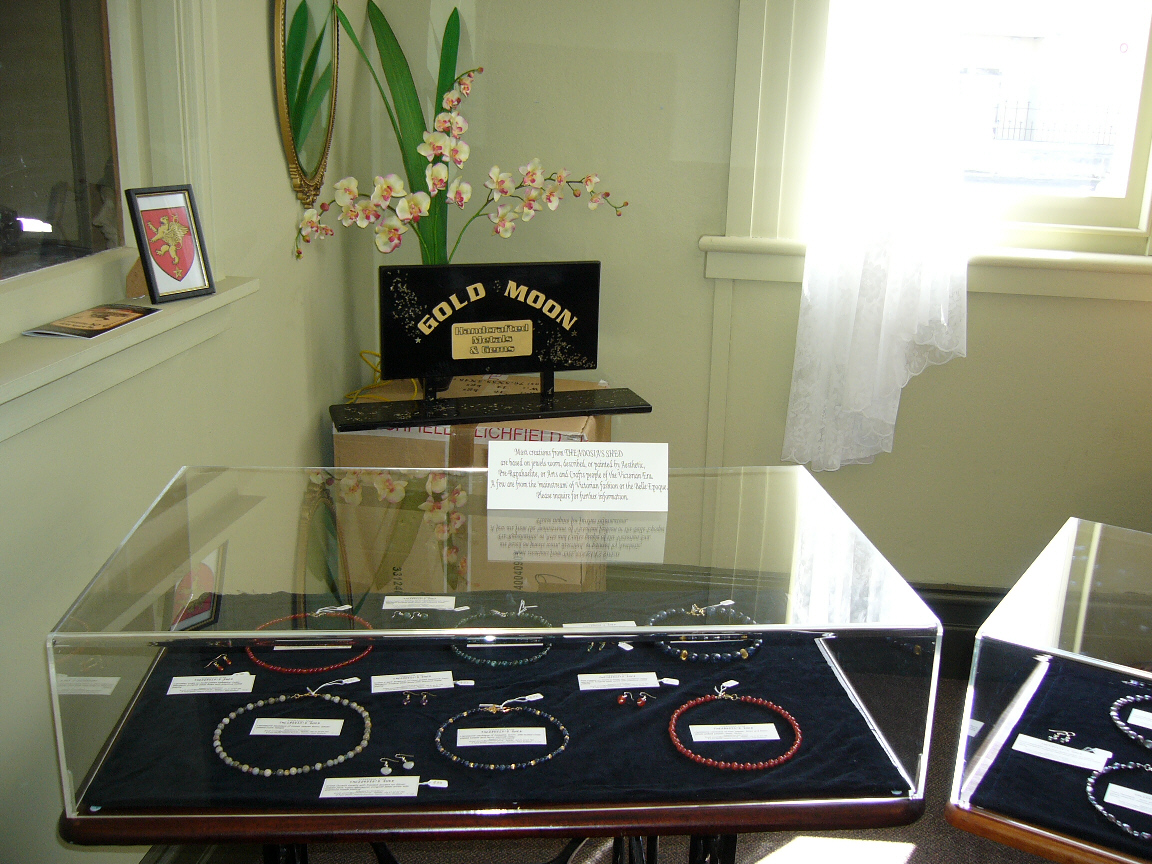 Display cases, left side of door - these display creations by Theadosia of Theadosia's Shed, Wellington, who also supplied the bottle of champagne to bring down for the opening (thanks!) Jeweller's workbench behind to right. |