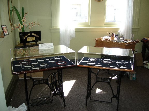 Close-up of one of the display cases with Theadosia's work, with the Gold Moon sign for the footpath behind. |