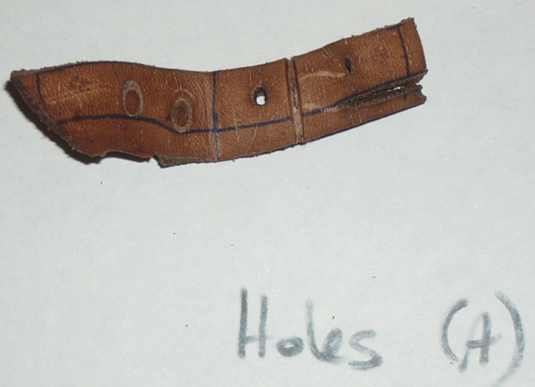 Conclusion: leather placed skin down in boiling water shrinks more evenly than leather placed skin up in simmering water. Leather on right was not soaked and so was placed dry in simmering water for 20 seconds. Uneven shrinkage resulted even though only simmering. NB Holes in leather were placed there later as part of testing the drilling vs the punching of holes. |