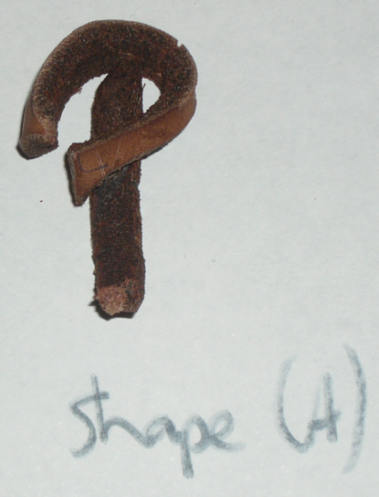 Shrinkage and Strength Test details: "Shape" - broke when hit with back of cleaver. Conclude tight coils coupled with narrow width too fragile for cuir bouilli armour! |