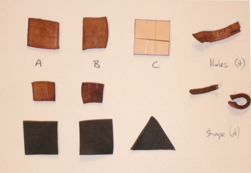 FIRST SHRINKAGE EXPERIMENT Rows: 1. Originally 4 cm x 4 cm bark-tanned leather (3 mm [7-8 oz] "russet") 2. Originally 2 cm x 2 cm bark-tanned leather (3 mm [7-8 oz] "russet") 3. Originally 4 cm x 4 cm chrome-tanned leather (1.2 mm [3 oz] dress leather) Columns: First column (A): 20 seconds in boiling water Second column (B): 40 seconds in boiling water "Holes": 40 seconds "Shape": 40 seconds |