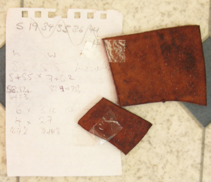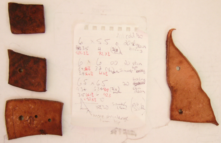 Shrinkage Spreadsheeted Results All bark-tanned pieces reached polymerisation temperature and therefore gained significant hardness. As part of this process each lost a percentage of length and width (i.e., they shrank!), and became significantly thicker. In some cases this resulted in the skin side becoming slightly smaller than the flesh side and pressing with weights was important to prevent curling at the edges. As expected, there was no change at all to chrome-tanned leather. (As chrome-tanned is non-period, it was included in test purely out of curiosity!) |