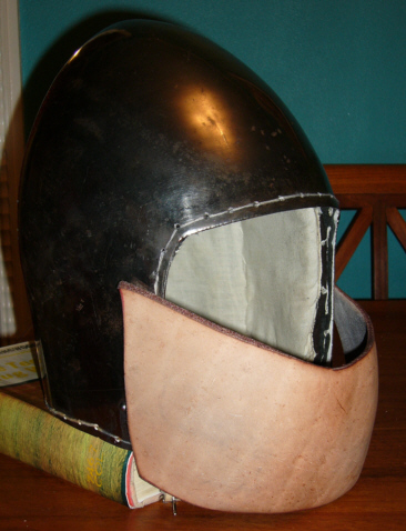 There is evidence for bascinets having an attached lower face-plate/early bevor. One illustration can be found in Ashdown1 . Given the cost of a full metal helmet, I decided to have a go at a cuir bouilli faceplate/bevor. |