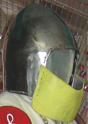 Since there was no pattern available, corrugated cardboard was fitted around the bascinet and trimmed until it approximated the required shape. The original bascinets which had this plate also had an extended back to the helmet (see fig 176). This meant that the cuir bouilli plate would sit proud of the base of the current helmet.